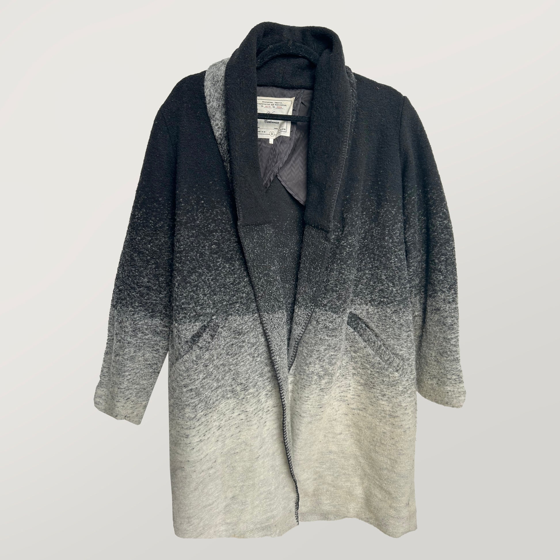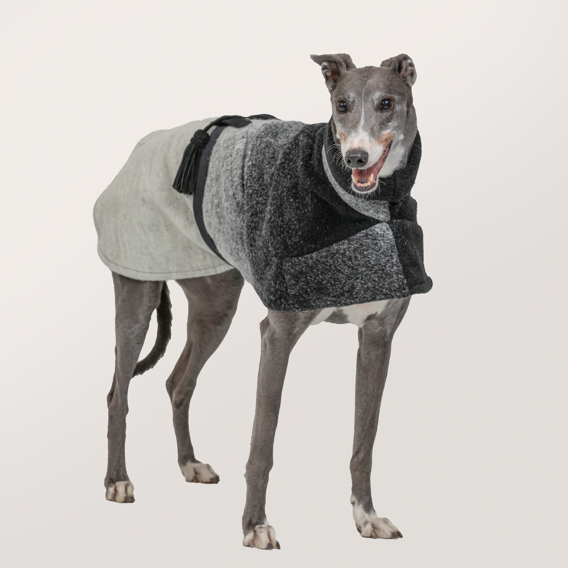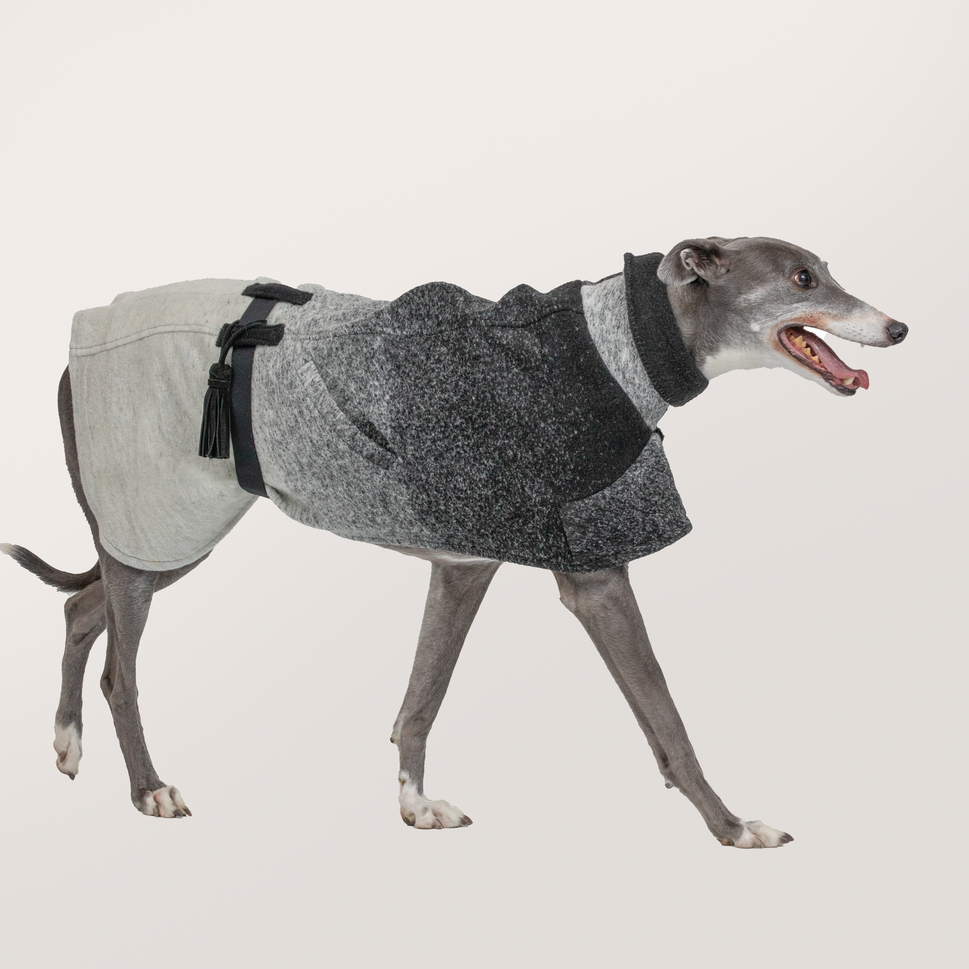 Verge New Zealand's donated wool blend jacket in grey and white is reimagined by Once Upon A Kind. It offers a snug polo collar with pockets and a fully adjustable belt. The Kate Spade detachable black leather tassel brings a playful element of movement to the piece. Suitable for cold and dry weather to help your Greyhound stay warm and active.
