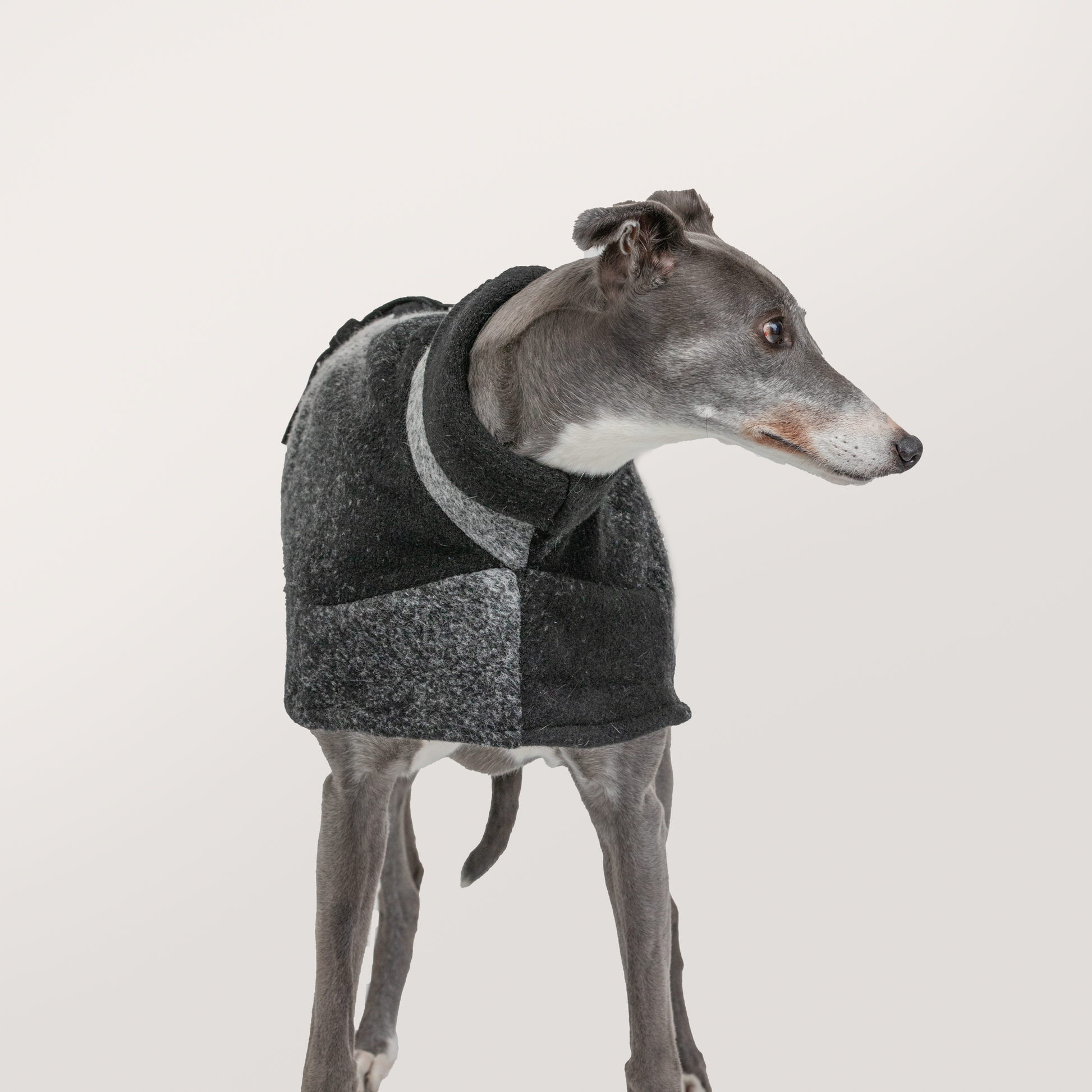 Modelled by Leah (small). Her neck-to-tail length is 68.5cm (27 inches), her circumference is 73.6cm (29 inches), and her height is 63.5cm (25 inches). Please look to our size guide to help you find the perfect fit for your Greyhound.